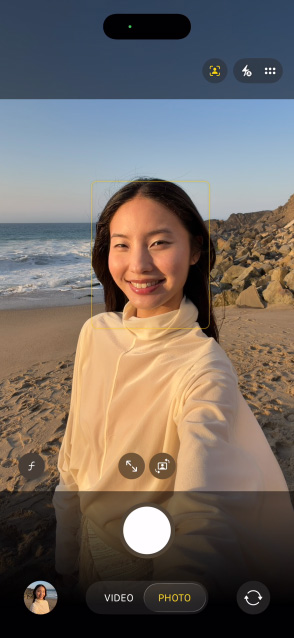 Ein neuer quadratischer Sensor gibt dir Zoom‑ und Drehoptionen und damit mehr Flexibilität beim Bildausschnitt deiner Selfies und Videos. So passen alle aufs Gruppenfoto. Ganz automatisch.