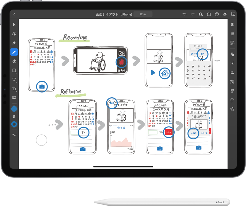iPad Pro. Dr Iimura and his students use iPad, Apple Pencil and Adobe Illustrator to sketch out and storyboard ideas for an accessibility app that helps teachers communicate with non‑verbal students.