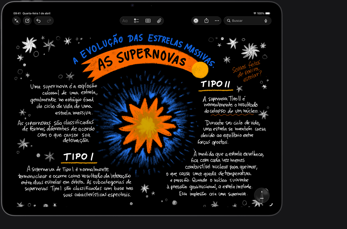 Com o Apple Pencil, tudo é intuitivo, preciso e mágico — não importa se você estiver desenhando, pintando, escrevendo ou fazendo marcações em documentos. Ele tem precisão absoluta, baixa latência, detecção de palma, e é sensível à inclinação. E o Apple Pencil Pro traz ainda mais funções para dar vida às suas ideias2.