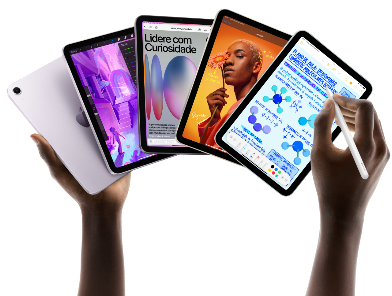 As mãos de uma pessoa seguram cinco modelos de iPad mini dispostos em forma de leque. Um modelo mostra a câmera traseira, os outros quatro mostram a tela. O Apple Pencil Pro está sendo usado para fazer anotações.