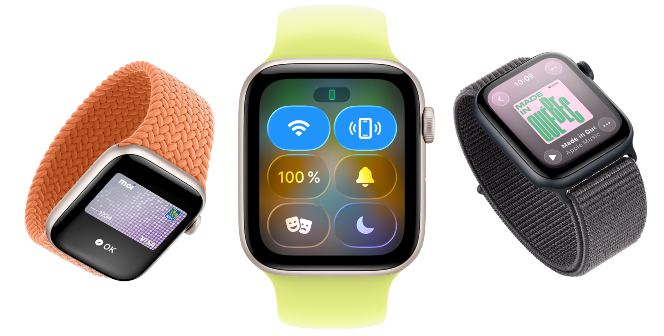 Plusieurs Apple Watch SE 3 avec boîtiers en aluminium offerts en comète et minuit, présentant des apps comme Signes vitaux et Fréquence cardiaque, le score de sommeil, les anneaux d’activité et un appel entrant