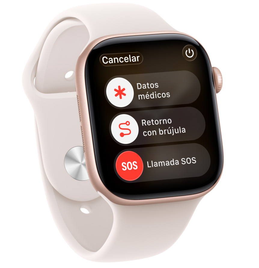 ¿Necesitas ayuda urgente? Para eso está el Apple Watch Series 11. Mantén pulsado el botón lateral para intentar llamar a los servicios de emergencia y compartir tu ubicación.23
