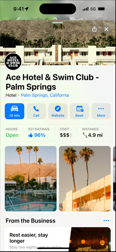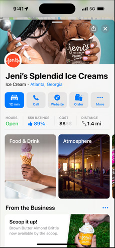 Apple Business Connect vous aide à créer et revendiquer votre fiche de lieu, et à la tenir à jour. Ajoutez-y des photos, des en‑têtes, des logos, des horaires et plus encore.