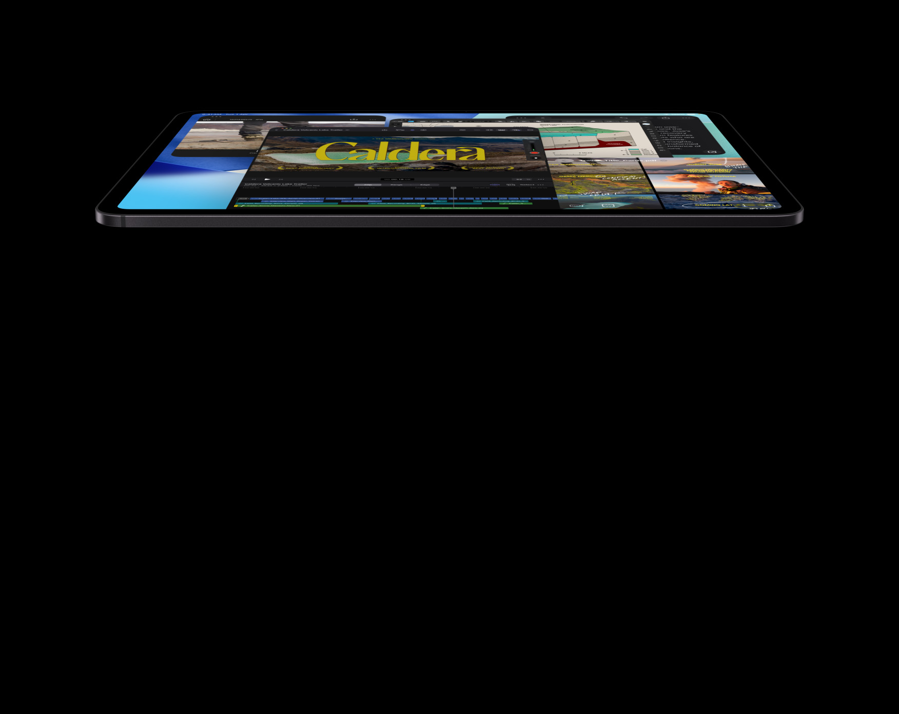 iPad Pro, front exterior, landscape orientation, space black colour, attached to Magic Keyboard, space black, display with multiple app windows: Final Cut Pro with multiple video editing features and timeline, Maps, Notes, media clips