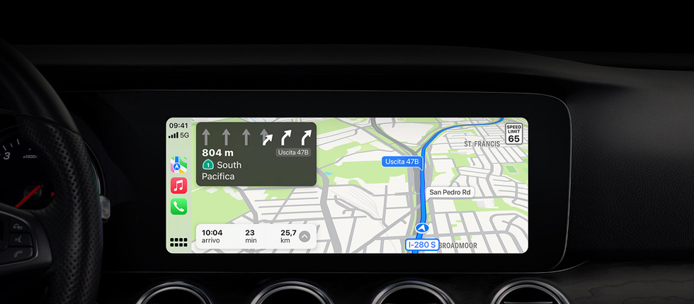 CarPlay porta tutta la potenza e la praticità di Mappe sul cruscotto della tua auto. Può darti suggerimenti intelligenti in base ai dati che hai già salvato sul tuo dispositivo, come gli indirizzi da email, messaggi, contatti e calendari. E viaggiare è ancora più semplice, grazie a mappe dettagliate e indicazioni vocali che ti guidano a ogni svolta.