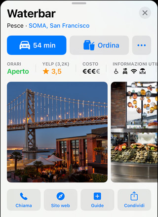 Scegli la tua destinazione, e una scheda interattiva ti mostrerà a colpo d’occhio tutto quello che ti serve: informazioni di base come indirizzo, orari, sito web e numero di telefono, insieme a dettagli come fascia di prezzo, gallerie di foto, Guide alla visita, tipi di pagamento accettati e perfino se puoi portare con te il tuo cane. Apri Flyover o “Guardati intorno” per farti un’idea del luogo e dei dintorni. E con un tap puoi perfino noleggiare una bici, pagare il parcheggio, ordinare la cena e fare mille altre cose, in modo rapido e sicuro.