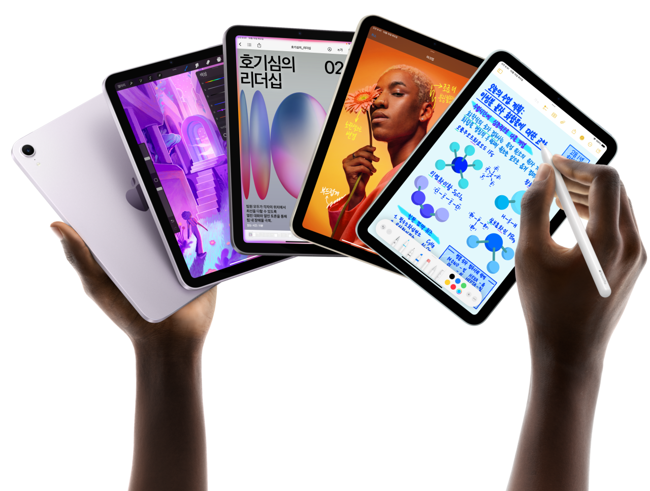 사용자가 iPad mini 모델 다섯 대를 부채처럼 펼쳐서 손에 들고 있는 모습. 한 대는 후면 카메라를, 나머지 네 대는 앞모습을 보여주고 있고, Apple Pencil Pro로 필기를 하고 있습니다.