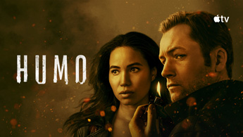 Un Apple TV 4K, dos HomePods y una televisión de pantalla plana muestran un tráiler editado de varias películas y series de Apple TV