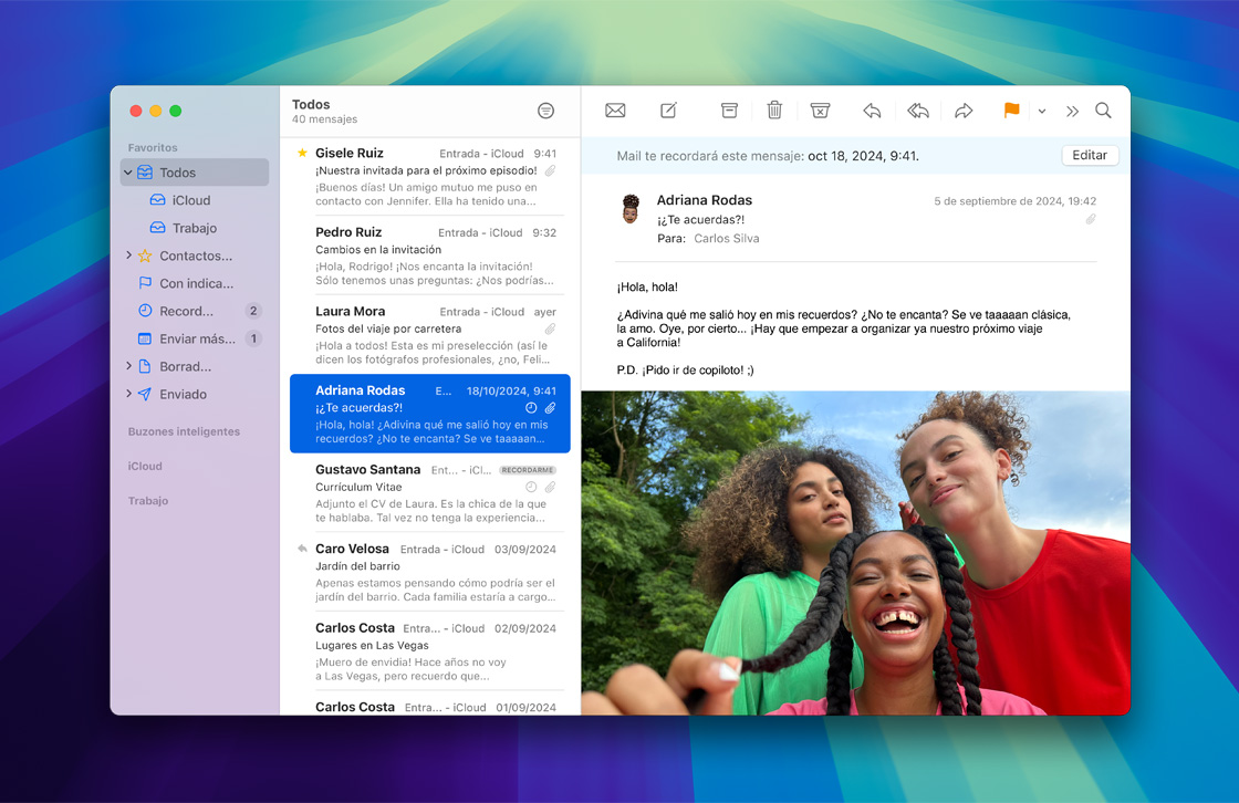 Mail en iCloud se integra a la perfección con la app Mail en tu iPhone, iPad o Mac. Y con iCloud.com puedes enviar y recibir correos desde cualquier lugar. Las funcionalidades de seguridad, como la protección contra correos no deseados y las opciones para prevenir el phishing, están diseñadas para impedir que tu bandeja de entrada se llene de correo basura. Además, configurar tu propia dirección de @icloud.com es facilísimo, y al suscribirte a iCloud+, podrás personalizarla con el dominio que quieras.