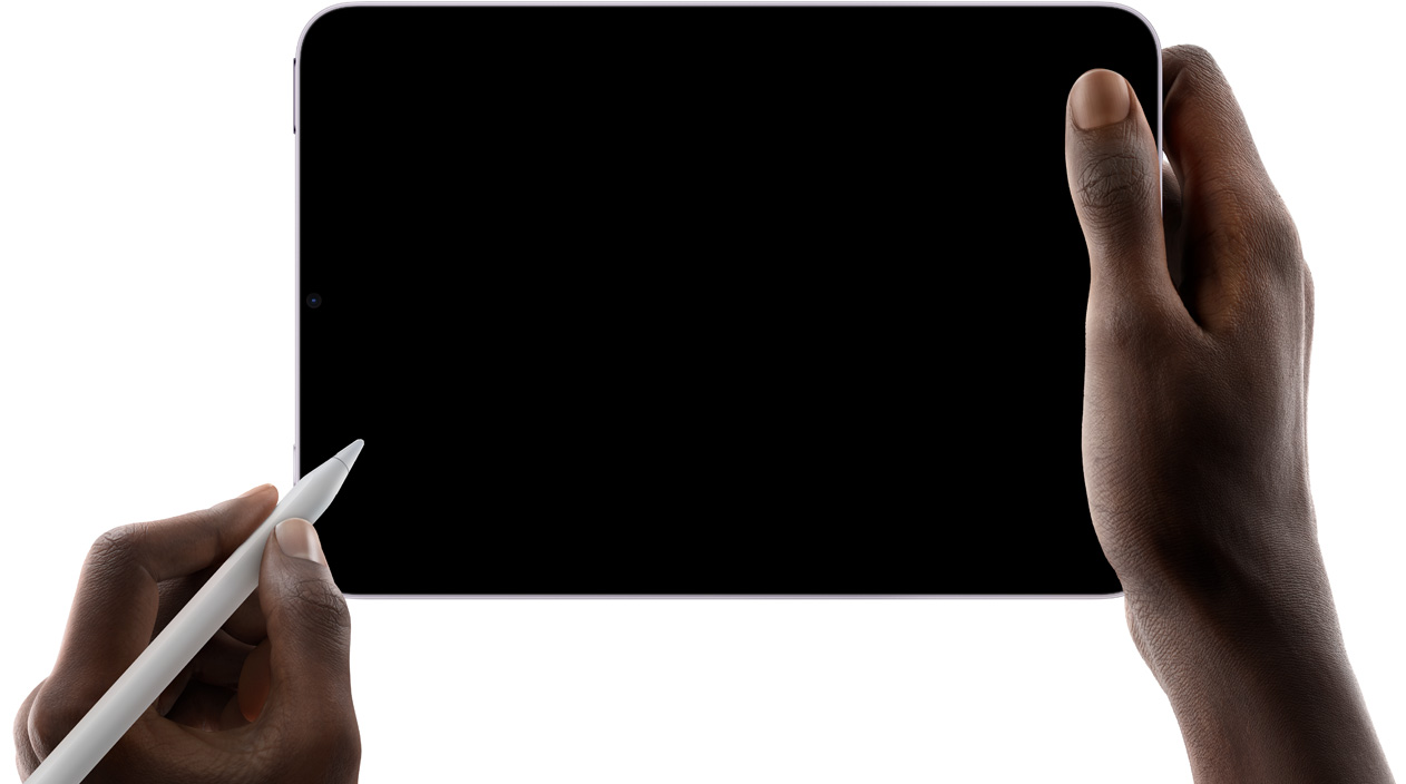 Een gebruiker houdt vijf iPad mini-modellen vast als een waaier. Van één model is de camera aan de achterkant te zien, van de andere modellen alleen het scherm. De gebruiker maakt notities met Apple Pencil Pro.