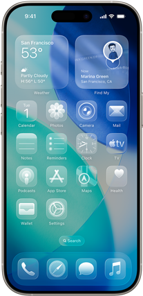 Liquid Glass z optycznymi cechami szkła i wrażeniem płynności wprowadza nowy, pełen ekspresji dizajn na ekran blokady i ekran główny, a także do centrum sterowania oraz aplikacji i nie tylko.