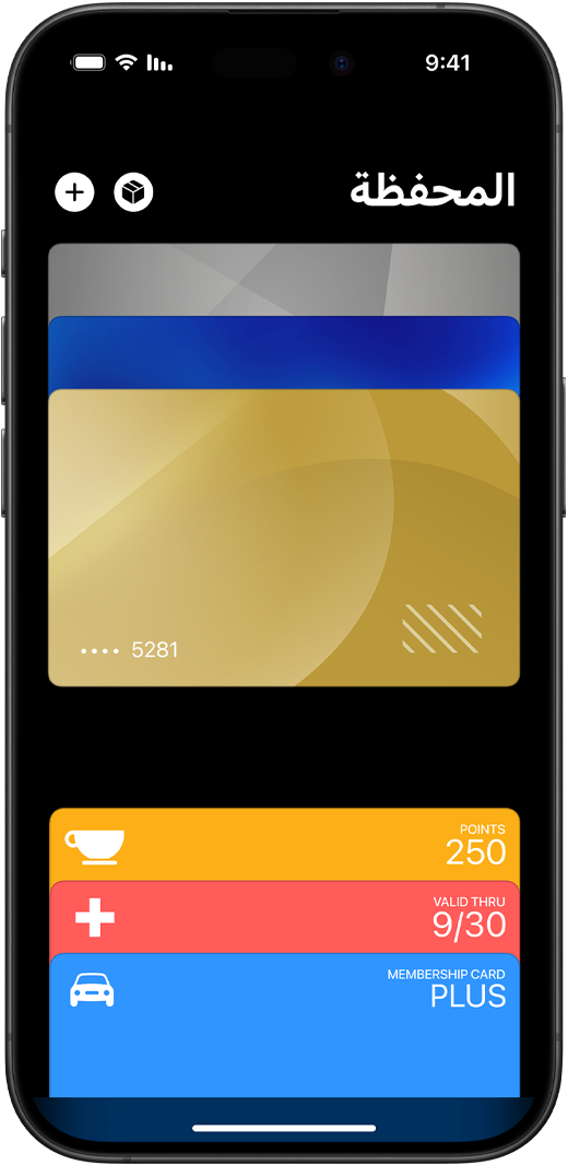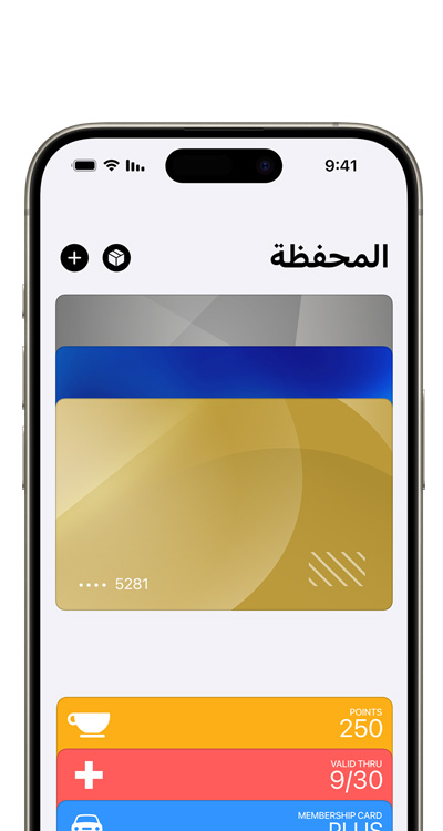 • تطبيق المحفظة من Apple هو تطبيق في iPhone وApple Watch يساعدك على ترتيب بطاقات الائتمان والسحب وبطاقات المواصلات وبطاقات صعود الطائرة والتذاكر وبطاقات المكافآت وغيرها، وحفظها بشكل آمن ومريح في مكان واحد.