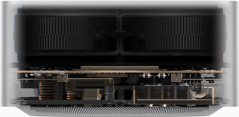 Within the 19.7-centimeter-square Mac Studio enclosure lies a thermal system designed to let M4 Max or M3 Ultra fly through intensive tasks at lightning-fast speeds. Even with so much incredible power, Mac Studio stays quiet, so it never interferes with your workflow.