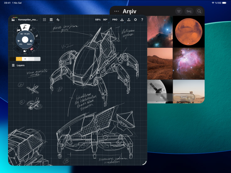 3 adet iPad Pro aygıtı, önden dış görünüm, yatay pozisyonda, uzay siyahı, iPad Pro’nun üstünde Apple Pencil Pro duruyor, 3 ekranda fotoğraf düzenleme uygulamalarındaki açık projeler gösteriliyor, bir ekranda kırmızı arka planın önündeki bir model, diğer ekranda renk ayarlaması araçları, fotoğraf arşivi, yelpaze şeklinde açılmış indirilenler klasörü dosyaları ile mekanik tasarım eskizleri, son ekranda ise geometrik şekiller, el yazısı notlar ve formüller ile 3D modelleme yazılımı bulunuyor